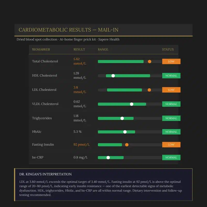 What’s Tested: Total Cholesterol · HDL · LDL · VLDL · Triglycerides · HbA1c · Fasting Insulin · hs-CRP (8 markers)